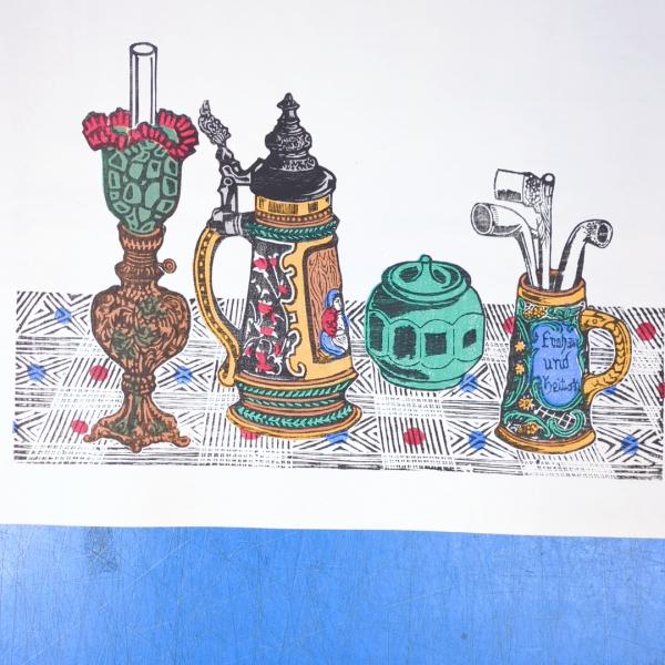 川上澄生木版画 南蛮的静物 ランプ,ビアジョッキ,パイプ 重要無形文化財越前奉書岩野市兵衛(人間国宝)手漉和紙