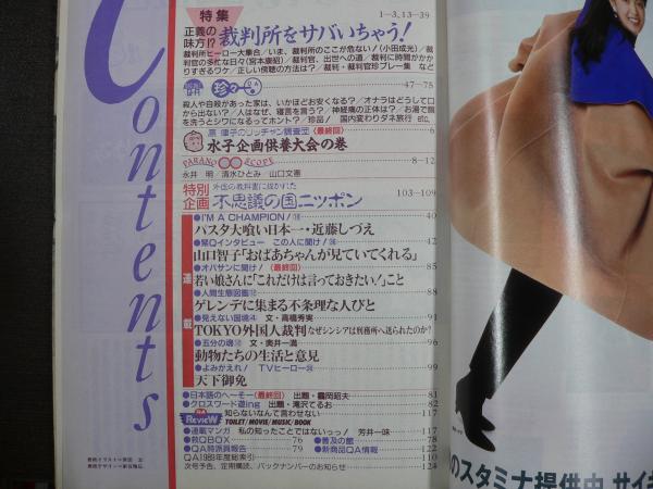 • 解説 裁判所ヒーロー大集合/裁判所ここが危ない(小田成光)/裁判官の多忙な日々(宮本康昭)/裁判官珍プレー集/原律子「水子企画供養大会」(最終回)/〈特別企画:外国教科書の中の不思議の国ニッポン/山口智子インタビュー/TOKYO外国人裁判・なぜシンシアは刑務所へ送られたのか?/天下御免ほか 少ヤケ・スレ・シミ