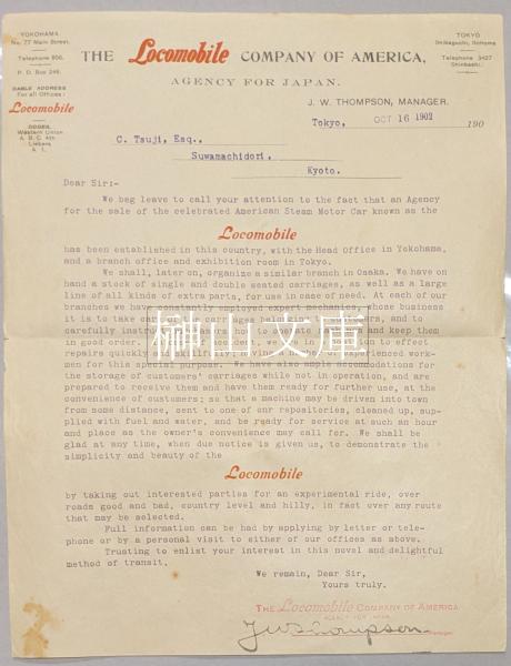• 解説 京都の辻家に宛てた案内一式、1902年10月16日付で横浜の代理店マネージャーJ.W.THOMPSONから辻家に送付されたものでカタログ各葉の右肩に「東京/横浜ロコモビル代理店」印あり、保存良好