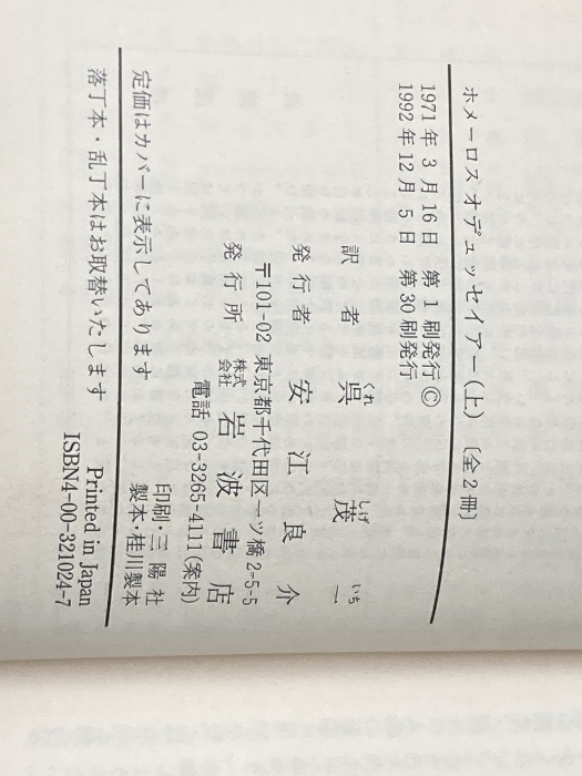 岩波文庫 オデュッセイアー 上下2冊 岩波書店 ホメーロス