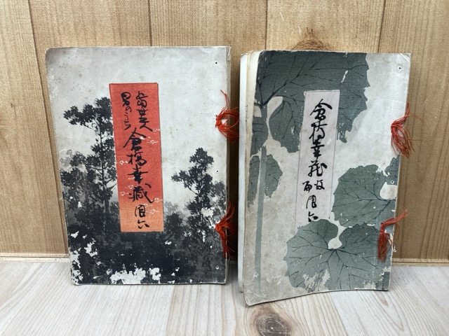 • 解説 裏表紙書入、1冊上部水染み大と表紙傷、他経年並/サイズ約22×15cm、各木版画1葉入り [ID:M130731]