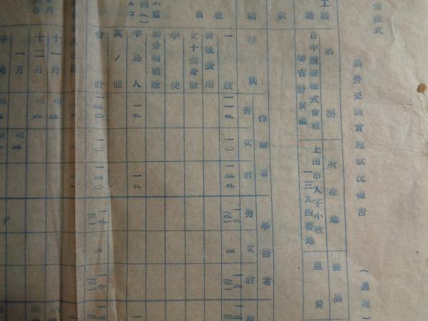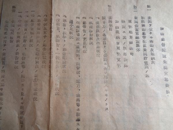 鉱山勤労配置査察実施状況報告(長野県小県郡・金城炭鉱株式会社、戦前)鉱山勤労配置査察実施状況報告(藁半紙にガリ版印刷とタイプ印刷の二種、若干内容が異なる。例えばガリ版では半島人の員数は7人と15人、勤労報国隊は5人と0、作業員の数にも違いがあるなど)合計10枚の資料(画像あり)