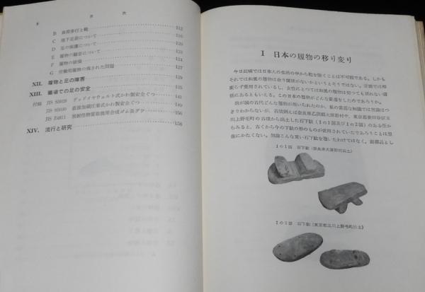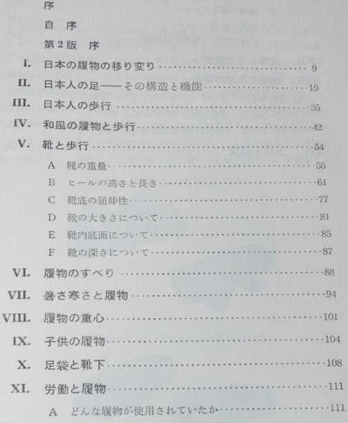 「日本の履物の移り変り/日本人の足/和風の履物と歩行/靴と歩行/暑さ寒さと履物/子供の履物/足袋と靴下/労働と履物/履物と足の障害/職場での足の安全/流行と研究/ほか」162p.