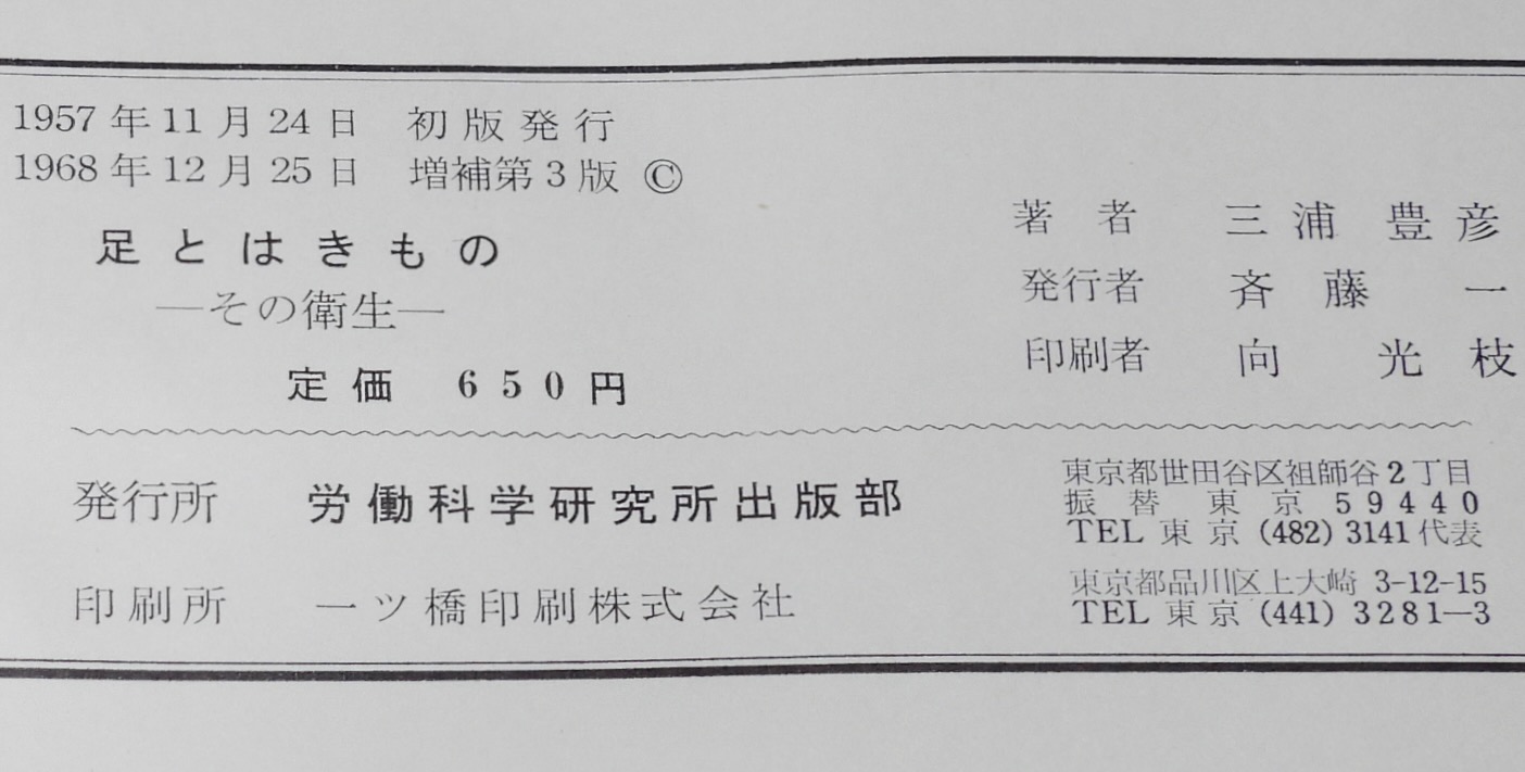 • 解説 労働科学叢書 XIII 足とはきもの その衛生 三浦豊彦 裸本 労働科学研究所出版部 1968年12月増補第3版 A5判ハードカバー.