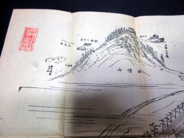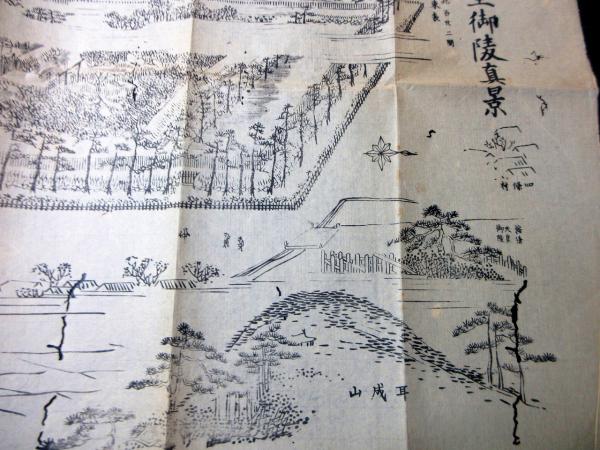 • 解説 明治19年(1886)古地図鳥瞰図「神武天皇御陵真景」1点/奥野陣七/古書古文書/木版摺りです。
