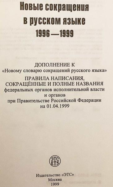 ●標題紙に「Дополнение к «Новому словарю сокращений русского языка». Правила написания, сокращённые и полные названия федеральных органов исполнительной власти и органов при Правительстве Российской Федерации на 01.04.1999.」 (『ロシア語新略語辞典』への補遺。1999年4月1日現在のロシア連邦連邦行政機関および政府附属機関の略称・正式名称ならびに表記規則。)とあり