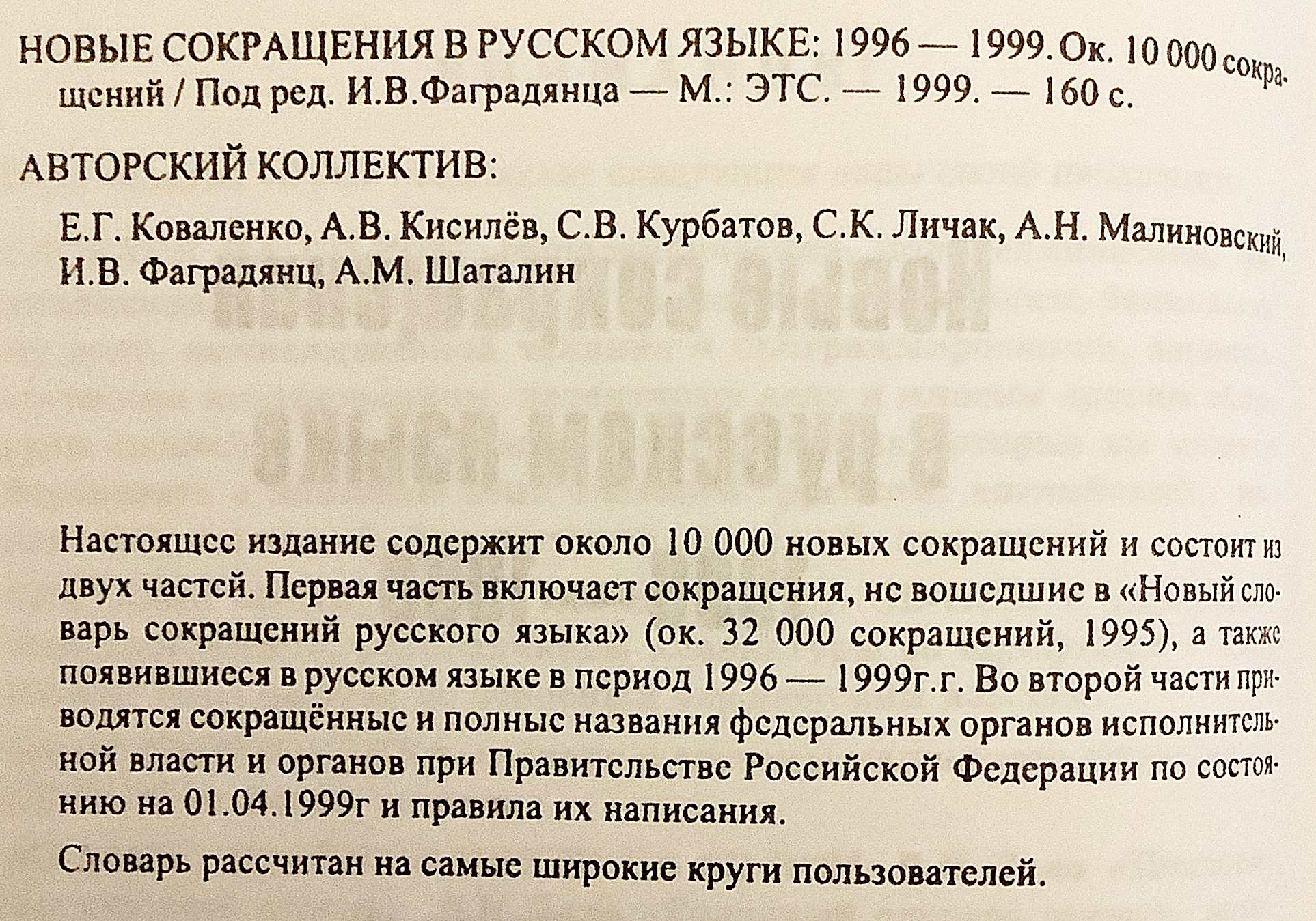 1996年から1999年にかけてロシア語に出現した新略語約1万語を収録した専門辞典。