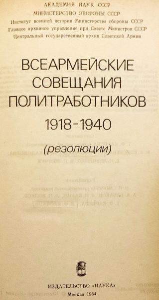 1918年から1940年にかけて開催された赤軍および艦隊の全軍政治労働者会議の決議を収録した史料集。