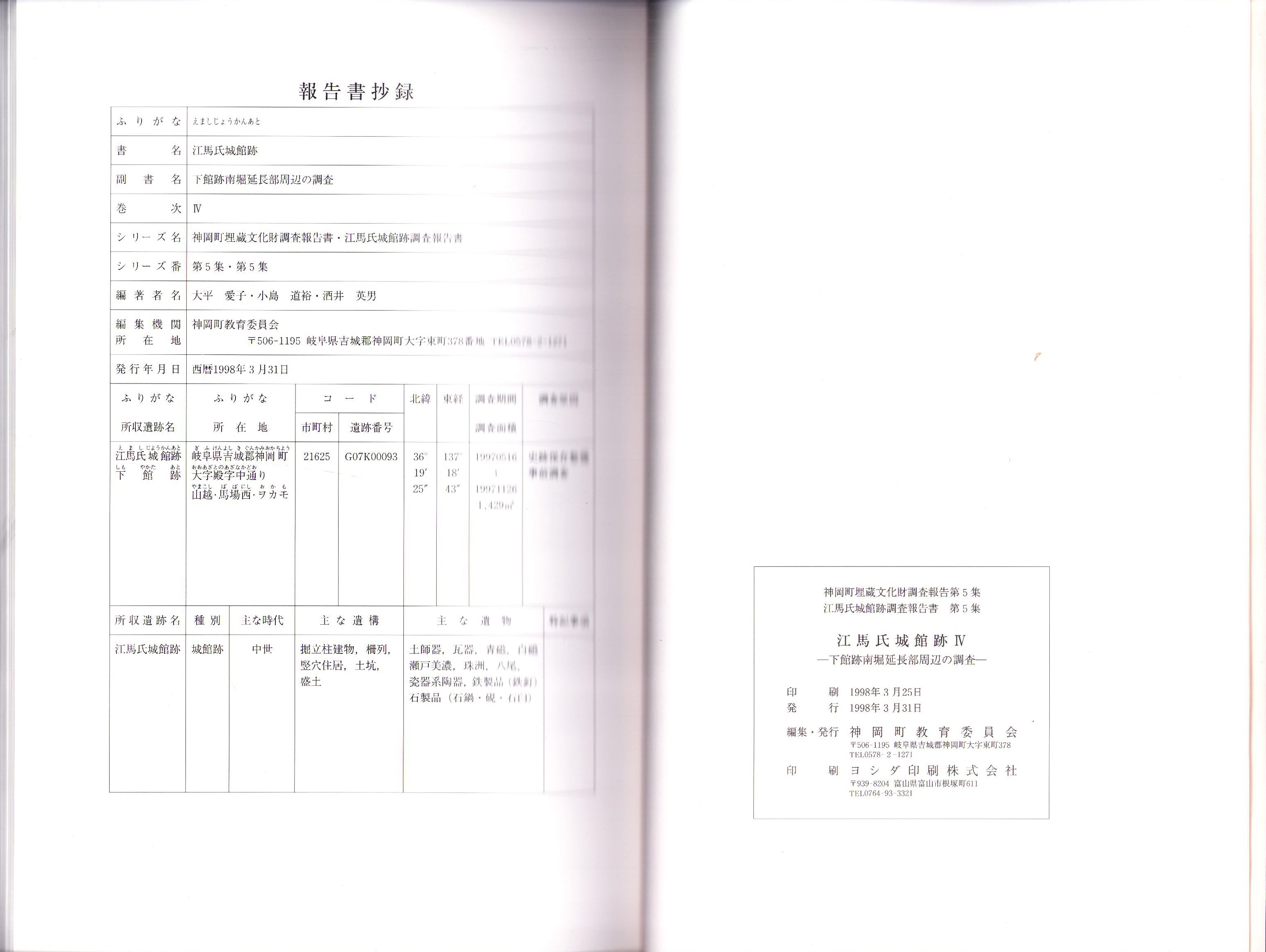 • 解説 美本、A4判、本文126頁、図版23頁、付図付(全1枚)、〈神岡町埋蔵文化財調査報告第5集、江馬氏城館跡調査報告書 第5集〉