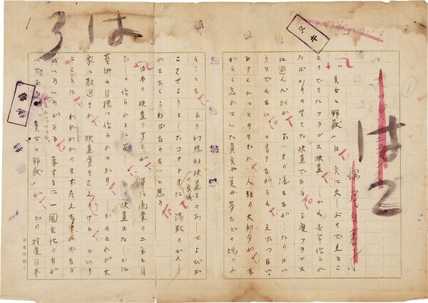 • 解説 『花の匂いのニュアンス』 ペン書 400字詰自家用箋3枚完 裁断 貼付 汚れ しみ 退色 新聞の入稿媒体として実際に使用された草稿。文選の効率を上げるため、裁断が必要になる。収集閲覧を目的として、作業後廃棄された紙片を仮止めした品物。(種別)随筆 #八木書店近代自筆物/1.草稿類 #95号近代文学特輯 95202437 ※自筆物につきましては、毎月25日前後に新蒐品を追加しております。PDF形式で御覧になりたい方は https://company.books-yagi.co.jp/archives/news/10928 を参照ください。