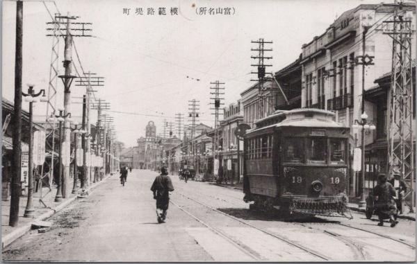 1000166■戦前 絵葉書■富山名所  模範路堤町(路面電車) 画鋲あと