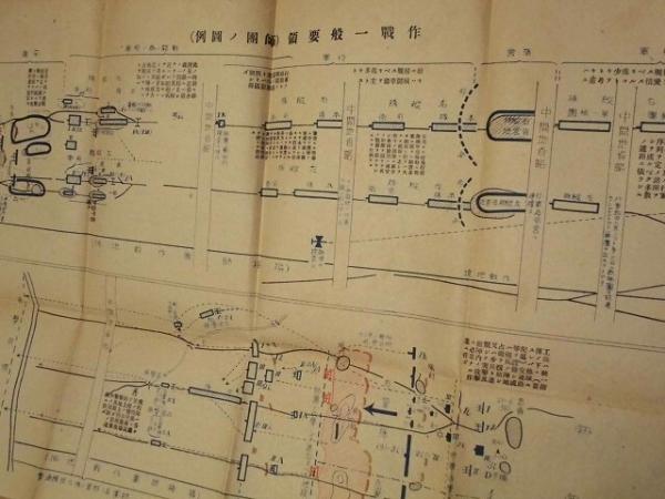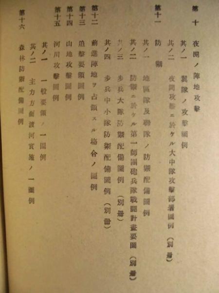• 著者 [折り図]・作戦一般要領(師団ノ図例) ・露営及前哨主力ヲ以テ防禦陣地ヲ占領シテ警戒スル場合ノ図例 ・広漠地ニ於ケル宿営及其ノ警戒ノ図例 ・戦術上攻撃重点選定要領図例 ・包囲実施要領図例 ・遭遇戦(統一戦闘参与)図例 ・遭遇戦(逐次戦闘加入)ノ図例 ・師団ノ開進配置図例 ・昼間ノ陣地攻撃ニ於ケル師団ノ攻撃部署図例 ・翼隊及歩兵聯大隊ノ攻撃図例 ・夜間攻撃ニ於ケル翼隊ノ攻撃図例 ・防禦ニ於ケル地区占領部隊竝ニ聯隊ノ防禦配備図例 ・前進陣地ヲ占領スル場合ノ図例 ・追撃要領図例 ・山地攻撃図例 ・河川攻撃(其ノ一)一般要領ノ一図例 ・河川攻撃(其ノ二)主力方面渡河実施ノ一図例 ・森林防禦配備図例
