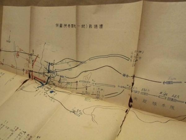 表紙には赤色のスタンプ「取扱注意」があります。半世紀以上の歳月を経過したものですので、軽い日焼けやスレ、一部の紙面端や角には折れ跡があります。「遭遇戦(統一戦闘参与)図例」の折り目には裂けがあります。