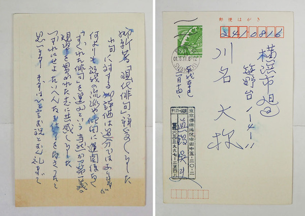 真鍋呉夫葉書 川名大宛 ペン書7行 少滲み有 『…流派や傾向に関係なく「すぐれた俳句」を選ぶという…』
