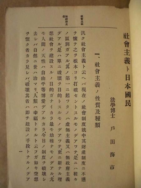 • 著者 法学博士 戸田海市 著   (一部抜粋:・社会主義ノ性質及種類 ・日本民族ノ根本性 ・不健全ナル思想ノ発生ハ如何ニシテ防止セラルベキカ)