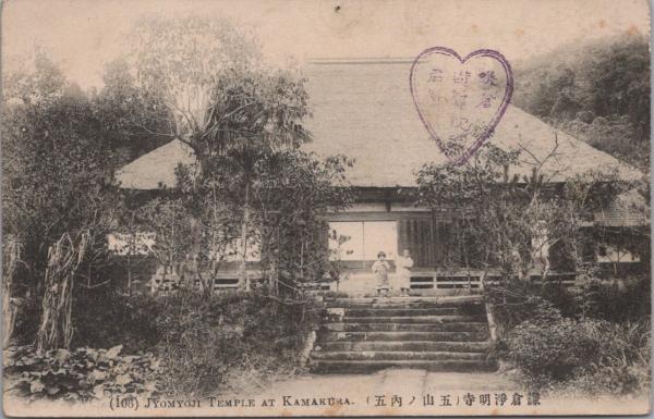 1000203■戦前 絵葉書■神奈川県 鎌倉浄明寺 画鋲あと 記念印