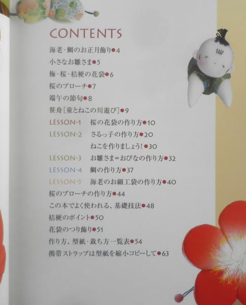 海老・鯛のお正月飾り 小さなお雛さま 梅・桜・桔梗の花袋 桜のブローチ 端午の節句 笹舟[童とねこの川遊び] 桜の花袋の作り方 さるっ子の作り方 ねこを作りましょう! お雛さま=おびなの作り方 鯛の作り方 海老のお細工袋の作り方 桜のブローチの作り方 この本でよく使われる、基礎技法 桔梗のポイント 花袋のつり飾り