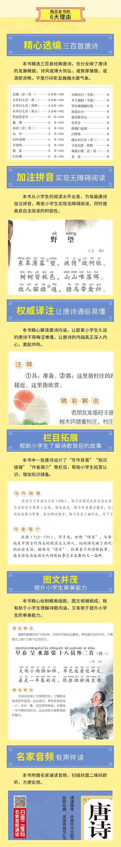 中国是诗的国度,唐诗则是中国诗歌中的精华,是中华民族珍贵的文化遗产。《儿童国学经典诵读:唐诗三百首(彩图注音版 二维码名家音频诵读)》选入了众多脍炙人口的名作,诗歌朗朗上口,节奏分明,更有利于孩子诵读,让它们感受诗歌的魅力,增加其文学和艺术的修养。同时它用丰富的题材展示了唐代社会生活的广阔画面,代表了中华五千年文明的精髓,是少年儿童学习古典文学的经典佳作,是一本优秀的儿童启蒙读物。