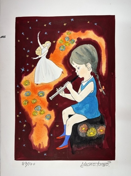 久保雅勇 手彩リトグラフ (仮題 笛を吹く女の子)