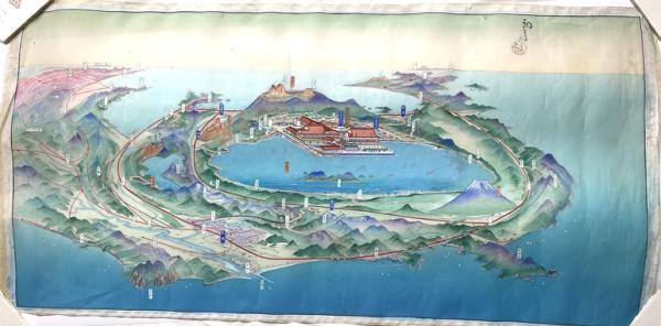 吉田初三郎 肉筆鳥瞰図絹本 三種 (栗沢・登別第一瀧本・洞爺湖温泉富士屋旅館(万世閣)
