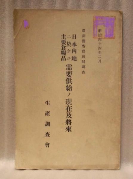 • 解説 明治四十四年二月 農商務省農務局調査 日本内地ニ於ケル主要食糧品 需要供給ノ現在及将来 明治44年3月7日発行 本体のみの冊子、A5判91ページ 正誤表付き 表紙には蔵書印と小印が押してあります。半世紀以上の歳月を経過したものですので、軽い日焼けやスレ、背イタミがあります。紙面の角には折れ跡や小さな折れがあります。