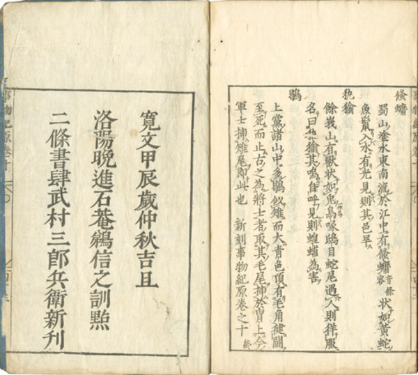 • 解説 武村三郎兵衛板 縦長大本27×16.2糎 〔柱〕事物起源 八・九冊目題簽欠