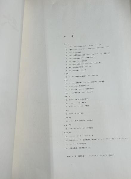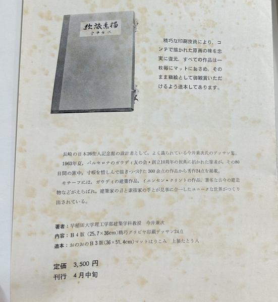 • 解説 早稲田大学理工学部建築学科教授で建築家としても活躍した今井の欧州旅行のスケッチ集 スペイン、スイス、イタリー、フランス、ドイツ、ノルウェー、スエーデン、デンマーク 帙風の箱付(輸送箱は欠) 経年ヤケシミ 無綴 扉+目次(裏に今井の序文)+図版24葉等揃い 出版案内紙付 大型37x52.5cm 昭和39年刊