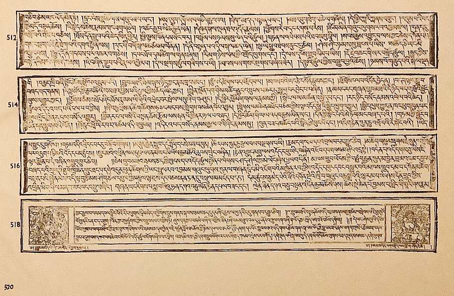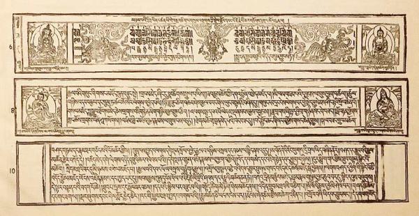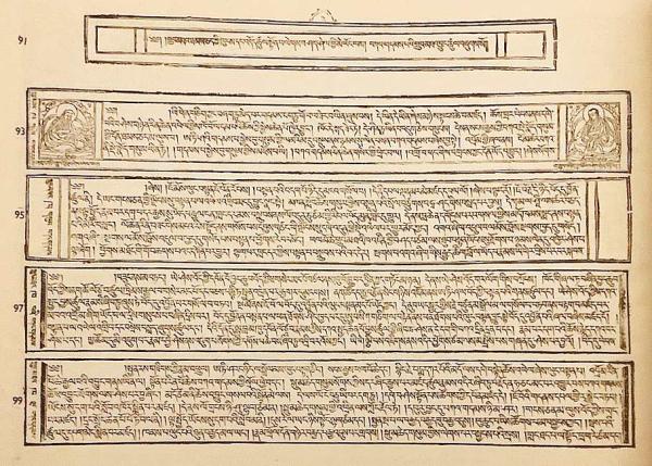 各頁はチベット木版印刷の伝統的様式に従い、横長の版面に本文が組まれ、章の区切りや重要箇所には仏や祖師の図像を伴う装飾的な版画が配されている。