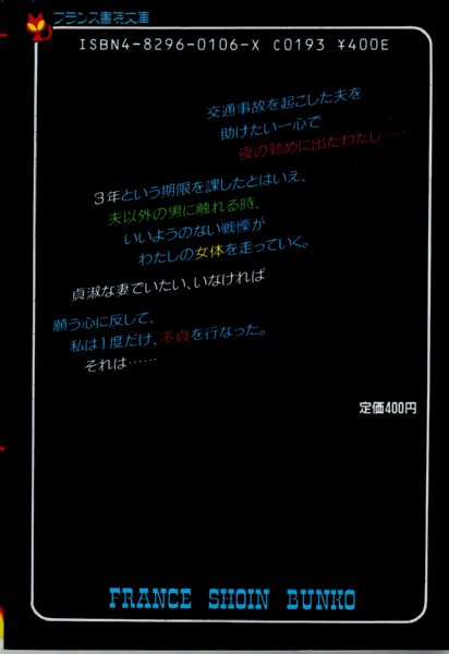 • 解説 1987年2月10日発行/第1刷/成人小説(グラビアなし)●頂部にヤケシミがあります。※古い文庫ですので多少の経年劣化はご理解くださいませ。※この商品は成人向け商品です。18歳以上の方のみご購入できます。※掲載品、通販商品は全て店頭・他サイト販売と併用です。売り切れの際はキャンセル処理とさせていただきますので、御了承ください。