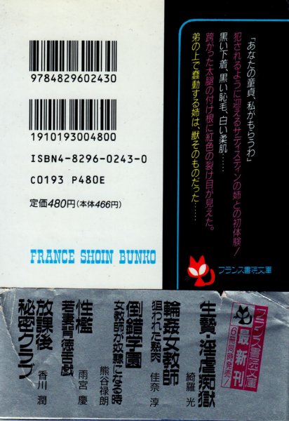 • 解説 1993年10月20日発行/第4刷/成人小説(グラビアなし)●帯に傷みがあります。※古い文庫ですので多少の経年劣化はご理解くださいませ。※この商品は成人向け商品です。18歳以上の方のみご購入できます。※掲載品、通販商品は全て店頭・他サイト販売と併用です。売り切れの際はキャンセル処理とさせていただきますので、御了承ください。