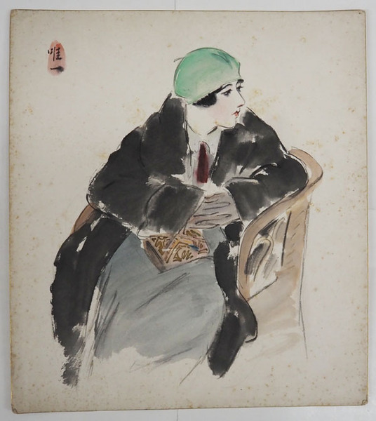 林唯一色紙 少痛少日焼少シミ有 <水彩画(椅子に座る女性)>