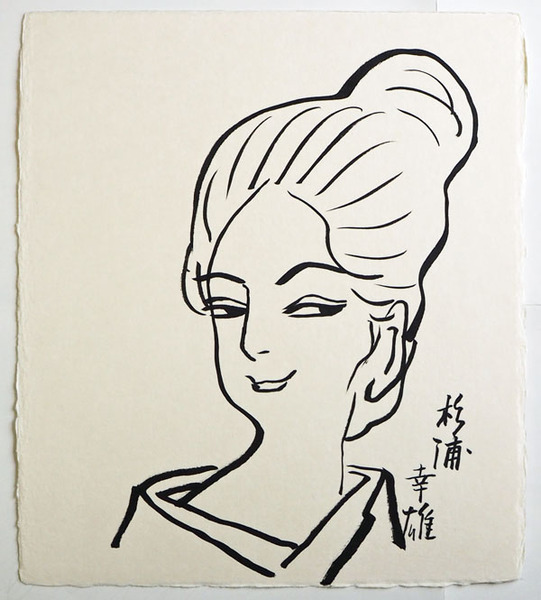杉浦幸雄色紙 「アトミックのおぼん」のイラスト 筆ペン書 和紙色紙