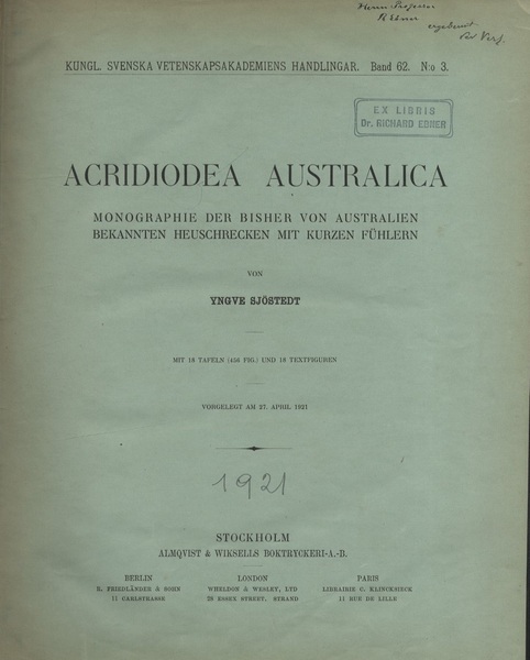 Acridiodea Australica Monographie der bisher von australien bekannten heuschrecken mit kurzen fuhlern <Kungl Svenska vetenskapsakademiens Handlingar Band.62 No.3>