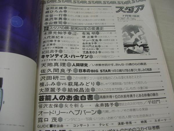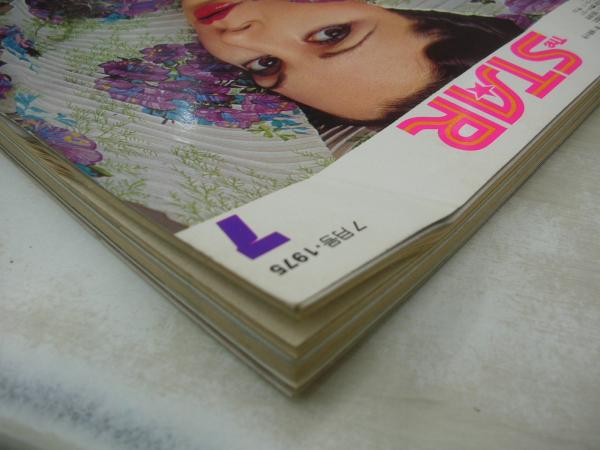 The STAR スタア 1975年07月号 平凡社 秋吉久美子 表紙 草刈正雄・巻頭グラビア 郷ひろみ 古谷一行 西川峰子 スタアの顔、50年うつりかわり マイティ・ルエロン マッハ朱文 市川八重+市川門之助 天地真理 沢田研二(記事) 児島美ゆき・巻中3折りピンナップ 木原美智子 八代亜紀 紀比呂子 金井克子 佐久間良子 露口茂という男(記事) 大原麗子(インタビュー記事) 黒沢年男 寺山修二 壇ふみ×萩尾みどり(対談記事) 上村一夫/藤の花の女 堺正章 人気女流漫画家の素顔(一条ゆかり、里中満智子、柴田あや子、竹宮恵子、神奈幸子) ※裏表紙から巻末頁上隅に曲がり折れ+3折ピンナップ下部に破れ痛みでています。