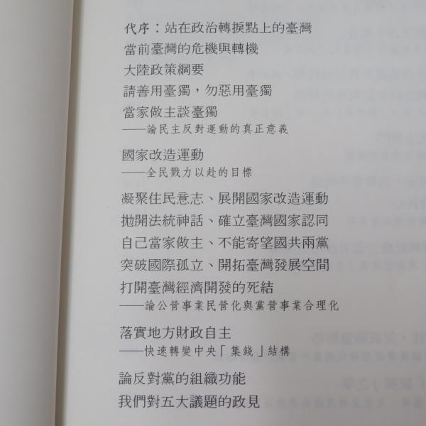 凝聚住民意志、展開國家改造運動拋開法統神話、確立臺灣國家認同自己當家做主、不能寄望國共兩黨突破國際孤立、開拓臺灣發展空間打開臺灣經濟開發的死結