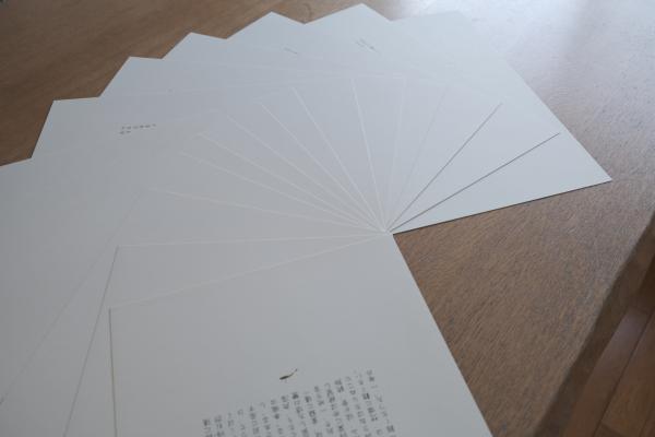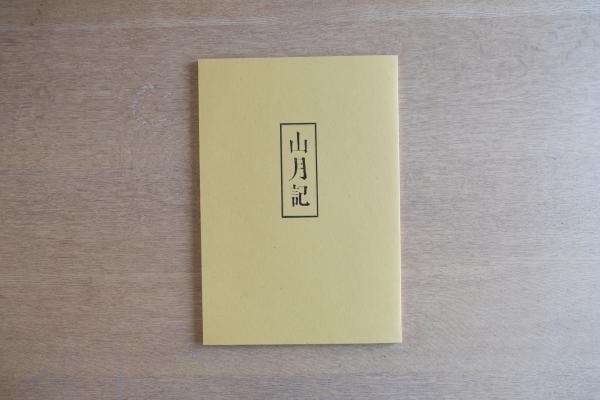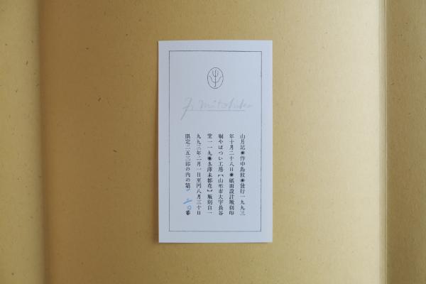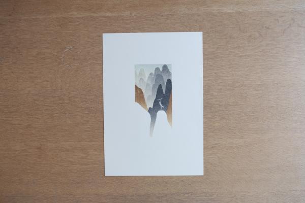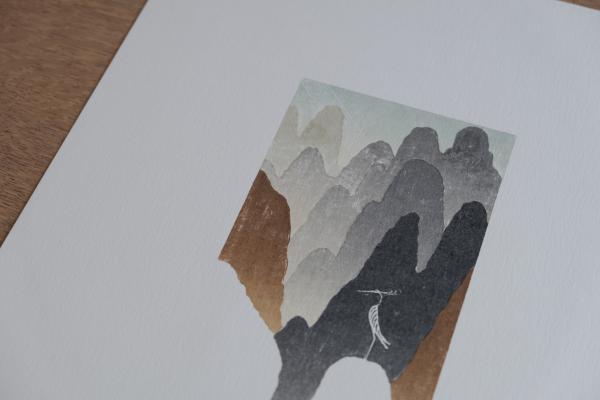 山水を思わせる山並みの重なりと、静かに佇む鳥を配した版画によって、文学作品の世界観を象徴的に表現している。