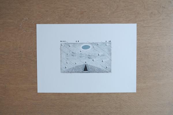 中央に配された版画には、音符や記号のような形象が静かに散りばめられ、言葉の余白や沈黙の気配を象徴的に表現している。詩と図像が呼応する構成の作品。