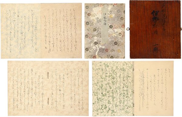 • 解説 綸子紋型染織表紙 書題箋 雲母摺下絵 列帖装 墨付七十七枚 一頁九行 少虫損  木箱入 24.4×17.7糎 木箱に天明院様御自筆とあり #93号古典籍特輯