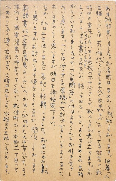 • 解説 島影盟宛 ペン書 12行 昭26・9・11(消印) 住所印 消印不鮮明 旧著「人生論」を踏まえた執筆依頼。「『人生問答』の件はよろこんでお引き受けしたいと思います」(発信地)詩運動社(受信地)駒込千駄木町 #八木書店近代自筆物/3.葉書類 #95号近代文学特輯 95007128 ※自筆物につきましては、毎月25日前後に新蒐品を追加しております。PDF形式で御覧になりたい方は https://company.books-yagi.co.jp/archives/news/10928 を参照ください。