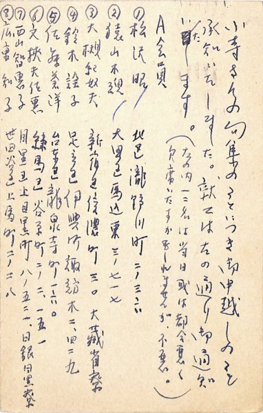 • 解説 青玄東京支社宛 ペン書 12行 昭34・12・1(消印) 住所氏名印 返信葉書 出版記念会の通知先か。「小寺さんの句集のことにつき御申越しのこと承知いたしました。就ては左の通り御通知いたします」。(発信地)世田谷区上馬町(受信地)港区麻布笄町 #八木書店近代自筆物/3.葉書類 #95号近代文学特輯 95203449 ※自筆物につきましては、毎月25日前後に新蒐品を追加しております。PDF形式で御覧になりたい方は https://company.books-yagi.co.jp/archives/news/10928 を参照ください。