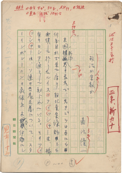 • 解説 『政治か宗教か』 ペン書 200字詰原稿用紙40枚完 レーニンの遺体に保存処置が施されたことを枕に、政治と宗教の問題を考える。(種別)評論 #八木書店近代自筆物/1.草稿類 #95号近代文学特輯 95605344 ※自筆物につきましては、毎月25日前後に新蒐品を追加しております。PDF形式で御覧になりたい方は https://company.books-yagi.co.jp/archives/news/10928 を参照ください。