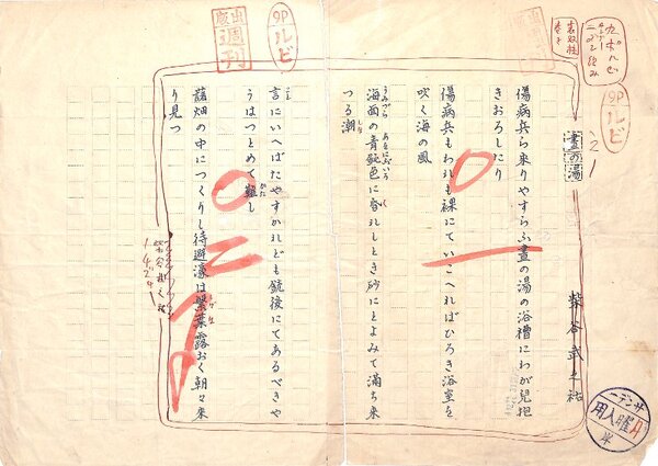 • 解説 『晝の湯』 ペン書 420字詰原稿用紙1枚完 裁断 「傷病兵ら來りやすらふ晝の湯の浴槽にわが兒抱きおろしたり」など5首。「サンデー毎日」掲載。(種別)短歌 #八木書店近代自筆物/1.草稿類 #95号近代文学特輯 95004727 ※自筆物につきましては、毎月25日前後に新蒐品を追加しております。PDF形式で御覧になりたい方は https://company.books-yagi.co.jp/archives/news/10928 を参照ください。