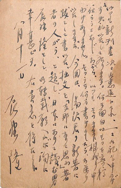 • 解説 創元社宛 ペン書 11行 昭15・8・11(消印) 「今回は、湯沢君の新著に跋として書いた、拙文と『支那にありて思ふ』著者の人がら、と題し、日本にありて讀む男辰野隆として、御掲載願へれば詢に幸甚です」。(受信地)創元社 #八木書店近代自筆物/3.葉書類 #95号近代文学特輯 95102667 ※自筆物につきましては、毎月25日前後に新蒐品を追加しております。PDF形式で御覧になりたい方は https://company.books-yagi.co.jp/archives/news/10928 を参照ください。