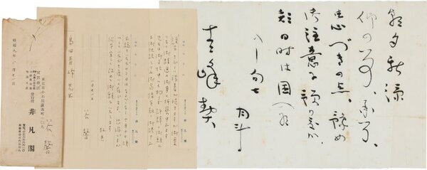 • 解説 島田青峰宛 ペン書 便箋2枚17行 封筒付 昭9・8・21(消印) 当時非凡閣で「俳句評釈選集」を発行していた模様。青峰の人脈で執筆者を確保していたか。青木月斗書簡付。「先日は御多忙中にも拘わらず評釋のお願ひを御快諾下され御高情有難く御禮申上ます」。(発信地)非凡閣(受信地)千葉大原町〔転送〕 #八木書店近代自筆物/2.書簡類 #95号近代文学特輯 95306318 ※自筆物につきましては、毎月25日前後に新蒐品を追加しております。PDF形式で御覧になりたい方は https://company.books-yagi.co.jp/archives/news/10928 を参照ください。