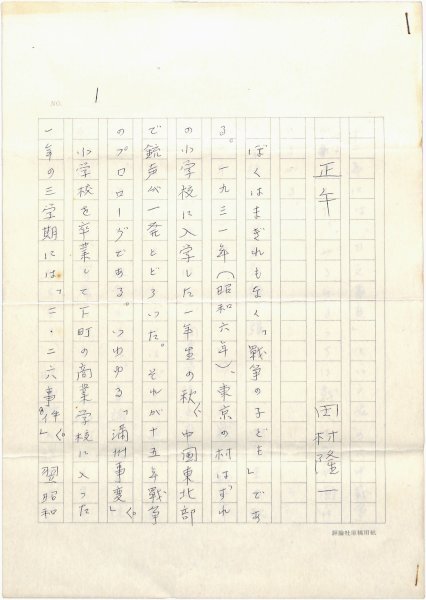 • 解説 『正午』 ペン書 200字詰原稿用紙9枚完 内容は自伝的散文。同名の詩とは異なる。「道を拓く : 私の転機」(朝日新聞「こころ」のページ 編・海竜社・昭61)では「敗戦の日 詩の発見」と題されている。(種別)随筆 #八木書店近代自筆物/1.草稿類 #95号近代文学特輯 95610038 ※自筆物につきましては、毎月25日前後に新蒐品を追加しております。PDF形式で御覧になりたい方は https://company.books-yagi.co.jp/archives/news/10928 を参照ください。