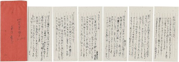 • 解説 川崎長太郎・奥様宛 ペン書 便箋6枚42行 昭60・12・18(消印) 速達 お悔やみ文。「十一月十日から十年ぶりの風邪で気管支カタルとなり熱が出てしまい河出書房のほうから、先生のご葬儀のことを聞き、なんとかお線香をあげさせて頂き最後のお別れをしたいと思いましたのに、どうにも身体が立ち上がらず、失礼することになってしまいました」。(発信地)世田谷区梅丘(受信地)小田原市中里 #八木書店近代自筆物/2.書簡類 #95号近代文学特輯 95011990 ※自筆物につきましては、毎月25日前後に新蒐品を追加しております。PDF形式で御覧になりたい方は https://company.books-yagi.co.jp/archives/news/10928 を参照ください。