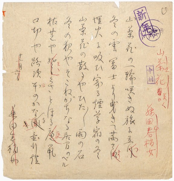 • 解説 『山茶花』 ペン書 便箋1枚完 「山茶花の一輪咲きぬ旅に立つ」等7句。大正~昭和初期において、新聞・雑誌の入稿媒体として実際に利用された草稿。(種別)俳句 #八木書店近代自筆物/1.草稿類 #95号近代文学特輯 95909934 ※自筆物につきましては、毎月25日前後に新蒐品を追加しております。PDF形式で御覧になりたい方は https://company.books-yagi.co.jp/archives/news/10928 を参照ください。