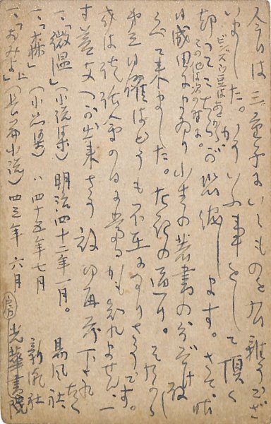 • 解説 風間光作宛 ペン書 11行 昭18・9・9(消印) やけ 礼状と報告を兼ねる。「昨日成田にまゐり小生の著書の分だけは取しらべて来ました。左記の通り。それから第三日曜はどうも不在になりさうです」。(発信地)千葉県印旛沼郡遠山村(受信地)本所向島請地 #八木書店近代自筆物/3.葉書類 #95号近代文学特輯 95811190 ※自筆物につきましては、毎月25日前後に新蒐品を追加しております。PDF形式で御覧になりたい方は https://company.books-yagi.co.jp/archives/news/10928 を参照ください。