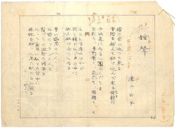 • 解説 『鍾声』 ペン書 400字詰原稿用紙2枚完 「鐘聲」「水たまり」の2篇。文末に「九・一〇・八」とある。(種別)近代詩 #八木書店近代自筆物/1.草稿類 #95号近代文学特輯 95001175 ※自筆物につきましては、毎月25日前後に新蒐品を追加しております。PDF形式で御覧になりたい方は https://company.books-yagi.co.jp/archives/news/10928 を参照ください。