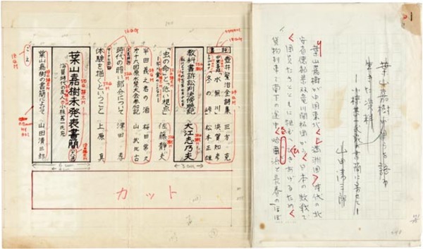 • 解説 『葉山嘉樹が自らを語る生きた資料』 ペン書 200字詰原稿用紙26枚完 一部裁断 「民主文学十月号」掲載。目次レイアウト2枚付。葉山嘉樹の小椋甚一宛書簡が発表された際の解説文。目次でのタイトルは「葉山嘉樹の書簡によせて」。(種別)解説 #八木書店近代自筆物/1.草稿類 #95号近代文学特輯 95507205 ※自筆物につきましては、毎月25日前後に新蒐品を追加しております。PDF形式で御覧になりたい方は https://company.books-yagi.co.jp/archives/news/10928 を参照ください。